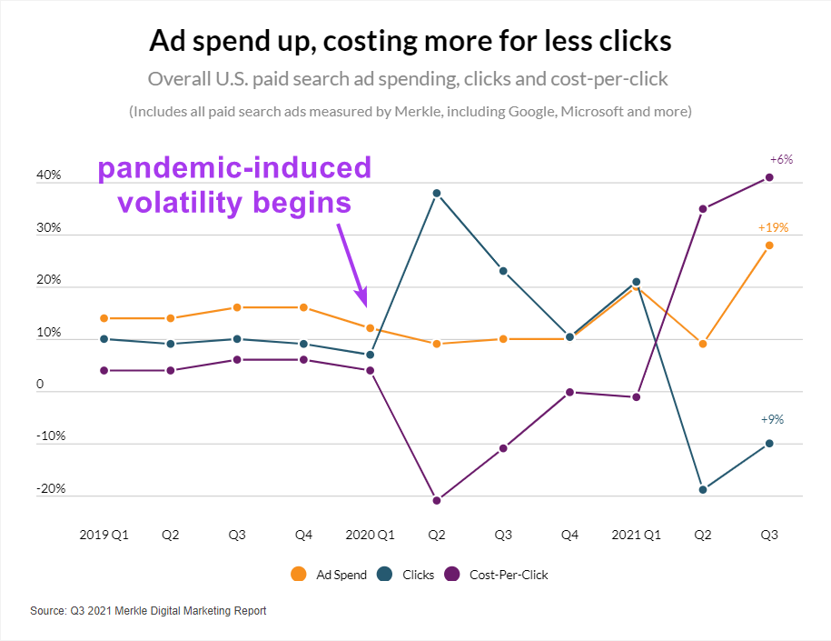 Ketika COVID-19 membuat dunia terkunci pada tahun 2020, orang dewasa mulai menghabiskan 28% lebih banyak waktu online, yang pada gilirannya membuat persaingan bayar per klik (PPC) menjadi overdrive. Kurangnya pasokan yang tiba-tiba telah menyebabkan tingkat biaya per klik (BPK) meroket. Perusahaan AS sekarang membayar lebih untuk klik yang lebih sedikit daripada sebelum pandemi.