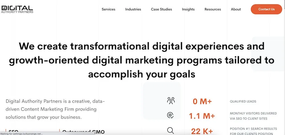 Digital Authority Partners adalah perusahaan konsultan digital yang membantu menciptakan pengalaman digital transformasional dan program pemasaran digital yang berfokus pada pertumbuhan yang disesuaikan dengan tujuan Anda. Enam layanan utama perusahaan meliputi SEO, manajemen PPC, strategi digital, 'CMO pecahan,' dan analitik.