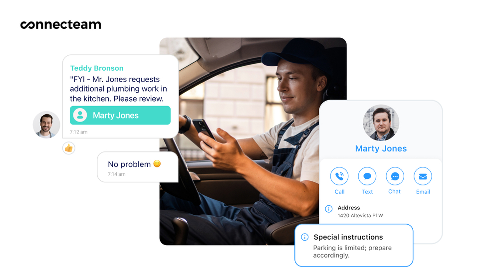Anda juga dapat menggunakan Connecteam untuk mengobrol dengan pembeli Anda secara real time . Ini adalah cara yang bagus untuk membicarakan masalah yang mereka temukan di tempat usaha Anda atau meminta kabar terbaru tentang suatu tugas.