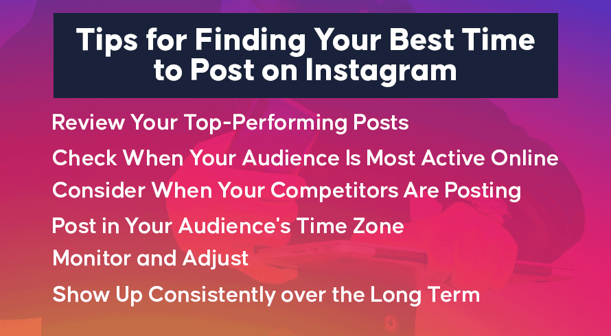 Untuk menemukan waktu terbaik Anda untuk memposting di Instagram, cobalah enam tips ini sebelum memublikasikan pembaruan Instagram Anda pada saat dan waktu yang tepat. Setelah Anda menganalisis semua data ini, Anda dapat mulai menyesuaikan strategi posting Instagram Anda. Jika sebagian besar posting Anda mendapatkan suka dan komentar terbanyak selama hari tertentu dalam seminggu dan pada jam tertentu, maka masuk akal untuk mempublikasikan pembaruan Instagram Anda selama waktu itu!