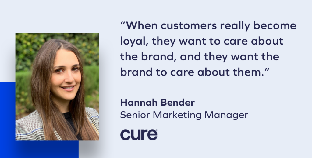 Jadi bagi kita, bagaimana kita membedakannya? Ini benar-benar tentang pendidikan dan komunikasi. Kami mengartikulasikan bagaimana kami berbeda dari merek lain, apa yang kami tawarkan, dan mengapa Cure lebih bermanfaat dan lebih baik untuk tubuh Anda daripada penawaran lain di luar sana. Pendidikan itu sulit. Anda harus berada di depan seseorang sebelum Anda memiliki kesempatan untuk benar-benar mendidik mereka. Kami menyukai program loyalitas sebagai saluran untuk menyampaikan pesan tidak hanya kepada pelanggan kami yang sudah ada tetapi juga pelanggan baru tentang mengapa kami memiliki begitu banyak pelanggan setia yang luar biasa yang benar-benar mengonsumsi Cure setiap hari.