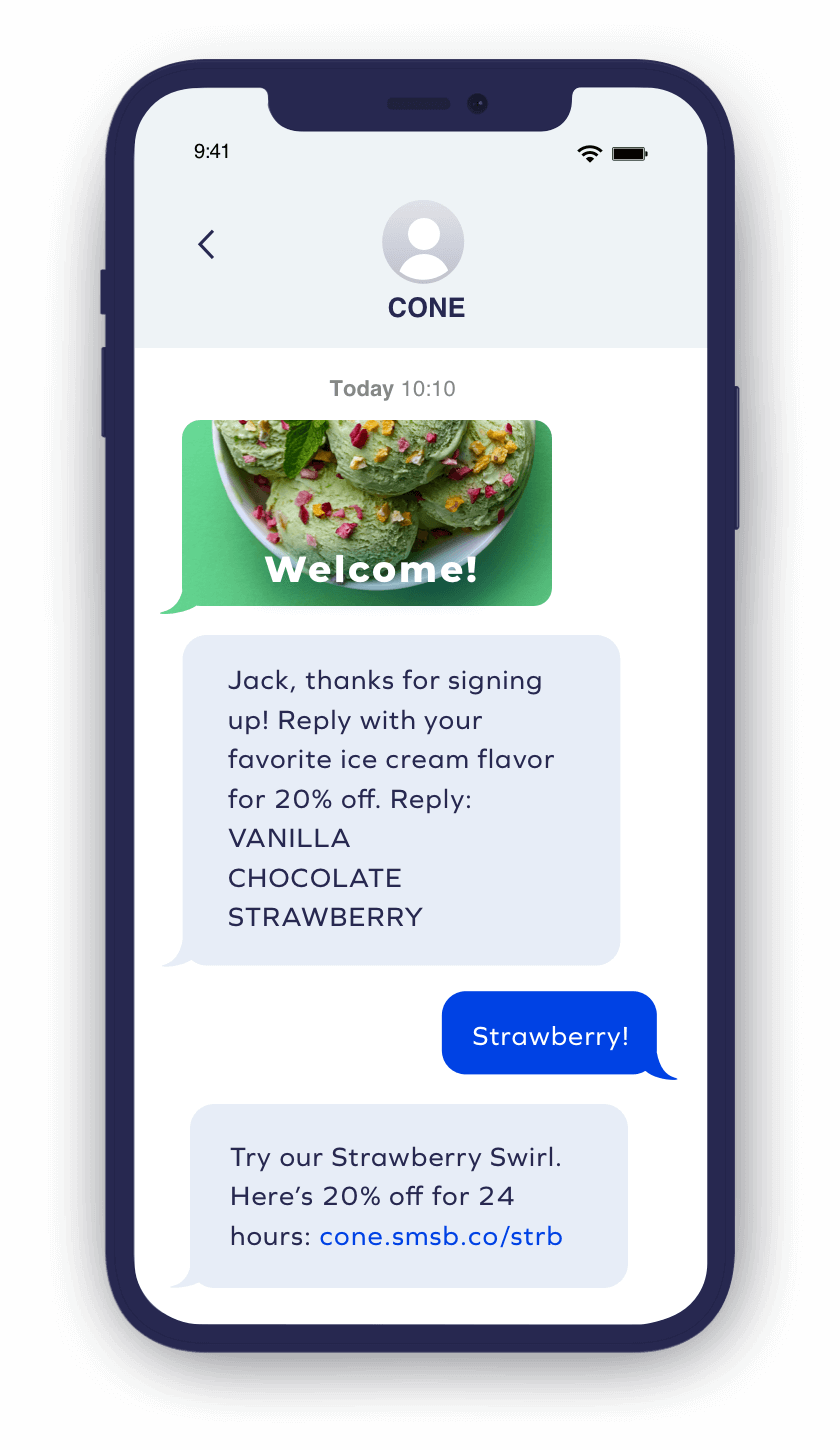 Dengan cara yang sama seperti yang disukai konsumen ketika pesan SMS dibuat hanya untuk mereka, mereka juga lebih suka jika penawarannya juga demikian. Buat poin untuk menunjukkan eksklusivitas untuk membuat setiap pelanggan merasa istimewa. Kirimi mereka SMS berisi kode diskon, hadiah dan hadiah khusus, serta akses awal ke penjualan atau rilis baru. Bereksperimenlah dengan kata dan frasa seperti eksklusif , hanya untuk Anda , Anda diundang , akses awal , kami merindukan Anda , manjakan diri Anda , terima kasih , dan selamat untuk meningkatkan teks Anda, dan uji A/B salinan pesan Anda untuk melihat apa yang berkinerja terbaik.