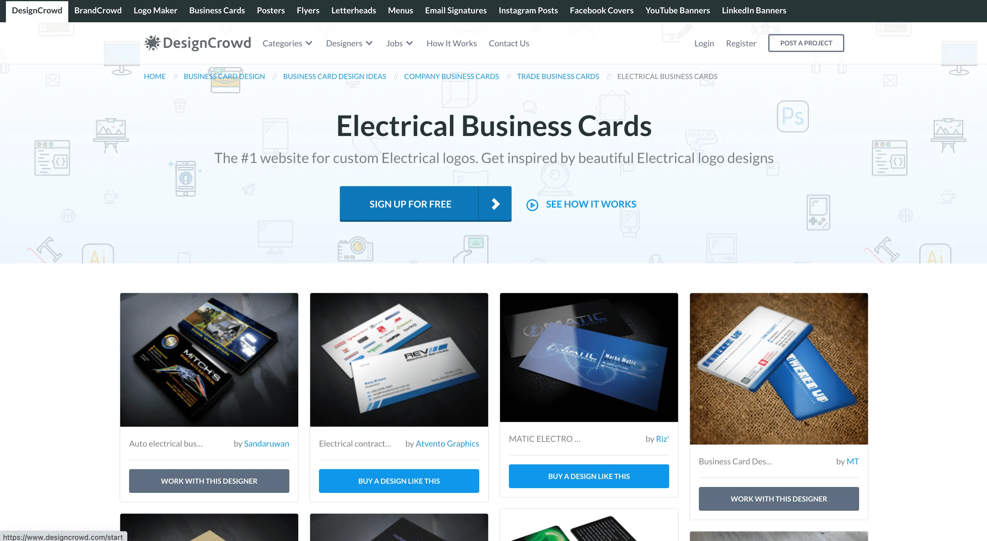 DesignCrowd adalah pilihan bagus bagi siapa saja yang mencari kartu nama yang dirancang khusus dari desainer grafis profesional. Dengan DesignCrowd, Anda dapat mengirimkan ringkasan desain Anda dan menerima desain dari beberapa desainer, lalu memilih salah satu yang paling sesuai dengan kebutuhan Anda. Ini memungkinkan Anda untuk mendapatkan kartu nama yang benar-benar unik dan terlihat profesional yang membedakan Anda dari pesaing.