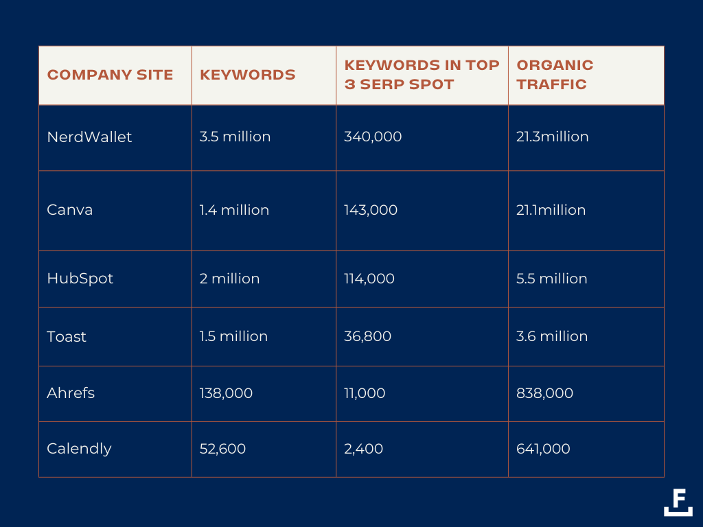 Menargetkan kata kunci ekor pendek dan panjang yang tepat dengan konten berkualitas adalah strategi ampuh untuk mengarahkan lalu lintas dan konversi di SaaS. Lihat saja statistik kata kunci berikut dari beberapa merek terkemuka di berbagai ceruk: