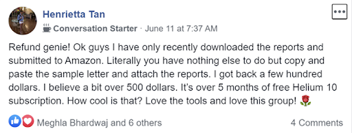 Ada cara lain untuk mendapatkan uang kembali dari Amazon. Jika Anda adalah anggota grup Facebook Helium 10, Anda akan melihat sejumlah besar pesan seperti ini: