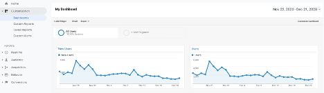 Seperti yang Anda lihat pada gambar di atas, Anda akan memiliki akses ke dasbor GA dasar, tetapi apa yang Anda lihat di sini nyaris tidak menggores permukaan kemampuan GA. Anda juga memiliki opsi untuk membuat dasbor khusus dengan opsi pemfilteran lanjutan. Dasbor khusus ini berguna jika Anda perlu membuat laporan untuk klien atau manajemen tingkat atas tentang metrik situs utama dan kata kunci yang Anda lacak.