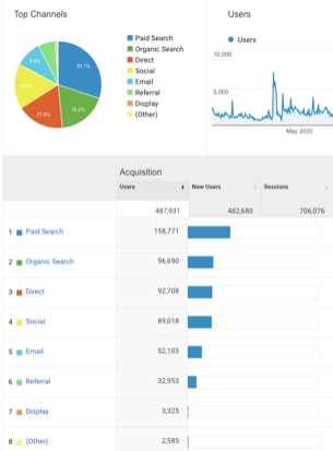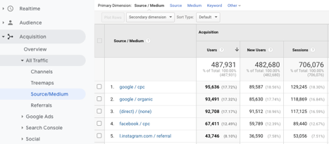 Gambar di atas menunjukkan bahwa iklan Google menghasilkan lalu lintas paling banyak, diikuti oleh organik. Buka Akuisisi > Semua Lalu Lintas > Sumber/Media untuk melihat informasi ini. Sebagai pengingat, volume lalu lintas ini adalah akibat langsung dari seberapa baik kinerja SEO dan kata kunci Anda.