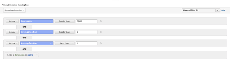 Langkah 2: Cari halaman yang memiliki jumlah tayangan tinggi dengan peringkat rata-rata 4 atau 5 dengan memilih dimensi Sekunder yang relevan dan memasukkan tayangan dan posisi rata-rata di bidang yang sesuai (ditampilkan di bawah).