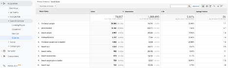Opsi kueri dari opsi menu Search Console akan memberi tahu Anda dengan tepat kata kunci penelusuran mana yang mendorong klik, dan berapa banyak klik yang Anda dapatkan dari kueri penelusuran tersebut dalam periode tertentu.