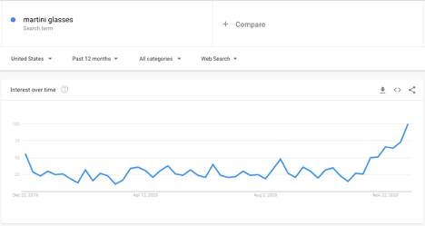 Misalnya, dengan menggunakan kata kunci “kacamata martini”, kita dapat melihat bahwa lebih banyak pencari yang memasukkan frasa ini ke Google dibandingkan bulan-bulan sebelumnya. Jika situs web Anda melayani pelanggan dengan minat terkait, Anda dapat berupaya mendapatkan lalu lintas penelusuran organik dan lalu lintas penelusuran berbayar ke kata kunci ini.