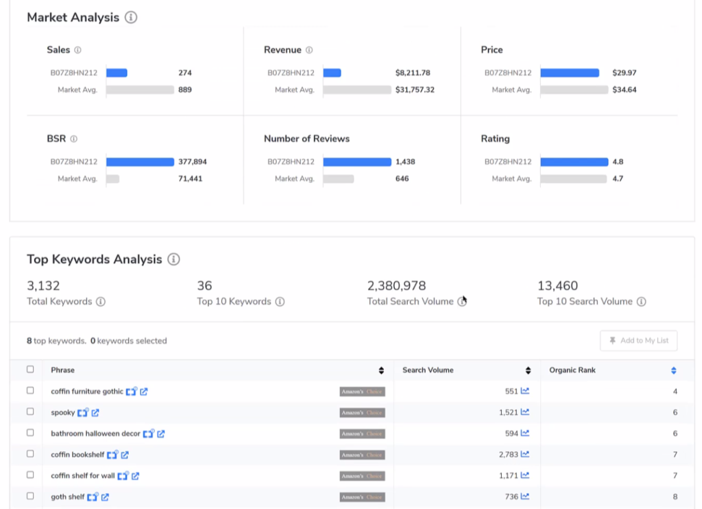 Ini juga memberi Anda "analisis pasar", membandingkan ASIN yang Anda cari dengan penjualan rata-rata pasar, harga, pendapatan, BSR, ulasan/peringkat. Alat ini melakukan pekerjaan yang luar biasa dalam mengilustrasikan pandangan holistik dari setiap daftar Amazon yang diberikan dalam konteks seluruh pasar, tidak hanya secara individual. Selain itu, Penganalisis Daftar menyertakan fitur analisis kata kunci yang memberi penjual akses ke berapa banyak kata kunci yang saat ini dimiliki oleh daftar produk di 10 teratas (termasuk volume pencarian).