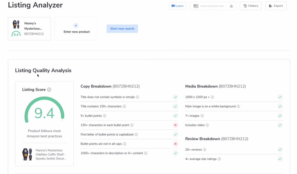 Penganalisis Daftar Helium 10 memungkinkan penjual untuk melihat secara mendalam kesehatan daftar Amazon dengan memasukkan ASIN (atau ASIN, jamak.) Penganalisis Daftar menilai halaman produk Amazon berdasarkan faktor-faktor seperti kapitalisasi poin-poin, penyertaan video produk, jumlah ulasan, dan banyak lagi.