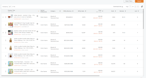 Jika Jungle Scout tidak memiliki tanda untuk menunjukkan variasi produk, Helium 10 menyertakan panah tarik-turun kecil. Sementara dalam tahap validasi produk penelitian Anda, mengidentifikasi variasi sangat penting untuk menentukan apakah riwayat penjualan suatu produk adalah untuk satu produk itu atau untuk kombinasi variasi produk tersebut (warna, ukuran, dll.)