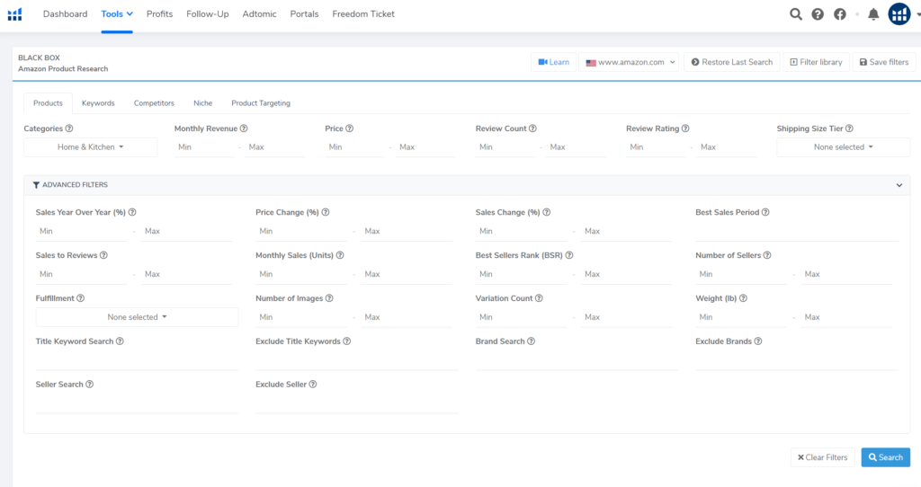 Black Box juga memiliki kemampuan pemfilteran eksklusif yang tidak dimiliki alat penjual Amazon lainnya, memungkinkan Anda untuk memfokuskan penelitian produk Amazon Anda dengan laser. Misalnya, ingin melihat kata kunci apa pun di Amazon yang ditelusuri setidaknya 5000 kali sebulan, dan 10 hasil organik teratas siapa yang memiliki setidaknya 5 produk yang memiliki kurang dari 150 ulasan, dan 6 produk yang menghasilkan pendapatan 10.000 dolar? Anda dapat melakukannya dengan mengklik tombol!