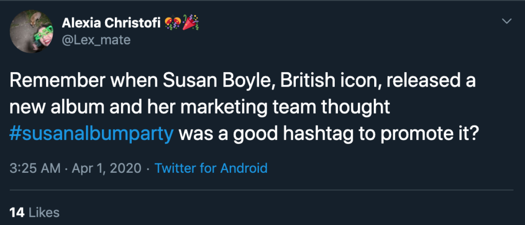 Sebelum meluncurkan kontes hashtag Anda, pertimbangkan cara apa pun hashtag dapat disalahartikan ketika kata-kata dirangkai. Ambil contoh, tagar yang digunakan untuk mempromosikan perilisan album penyanyi Susan Boyle pada 2012: #Susanalbumparty. Itu dimaksudkan untuk menjadi Pesta Album Susan , tetapi Anda mungkin melihat apa yang dilihat oleh media sosial lainnya. Pengguna Twitter terus membahas tagar yang disayangkan hari ini.