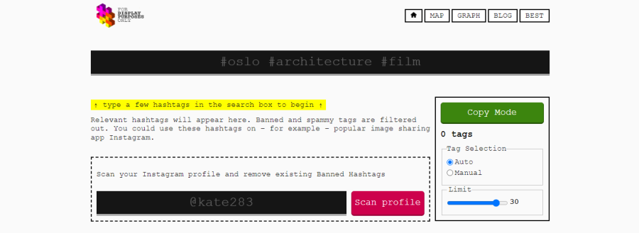 Ini adalah generator hashtag Instagram yang sangat populer lainnya. Anda hanya perlu memasukkan kata kunci foto Anda, atau URL Anda untuk menghasilkan tagar. Berdasarkan ini, Anda akan diberikan daftar tagar, yang diberi peringkat berdasarkan popularitasnya.
