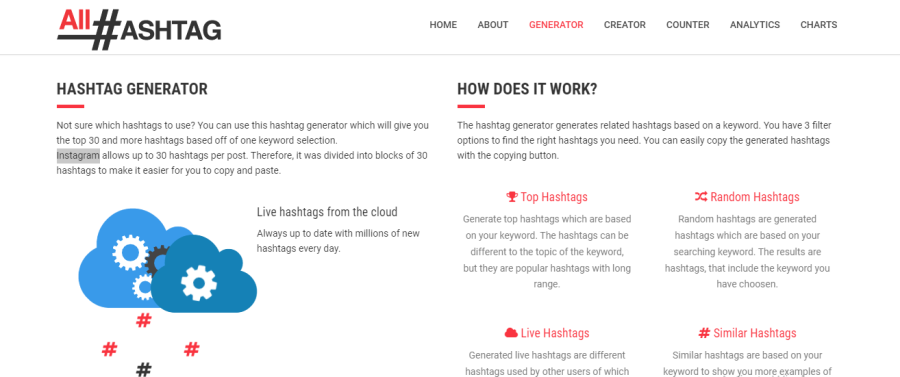 Ini adalah generator hashtag gratis terbaik di Instagram. Situs ini dimulai pada tahun 2015 untuk hanya menghasilkan tagar untuk berbagai alat media sosial. Sejak itu, mereka telah menambahkan sejumlah besar fitur untuk membantu Anda menganalisis tagar terbaik dan kata kunci terkait. Ada 4 jenis alat hashtag yang berbeda yang akan Anda temukan di dalamnya.
