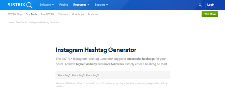Ini memiliki database lebih dari 15 miliar kombinasi tagar. Alat ini cukup gratis dan Anda dapat memiliki sebanyak 25 kueri sehari. Namun, setelah ini, Anda akan memerlukan pendaftaran. Dalam hasilnya, Anda akan diperlihatkan 30 tagar terbaik bersama dengan tagar lainnya berdasarkan popularitasnya.