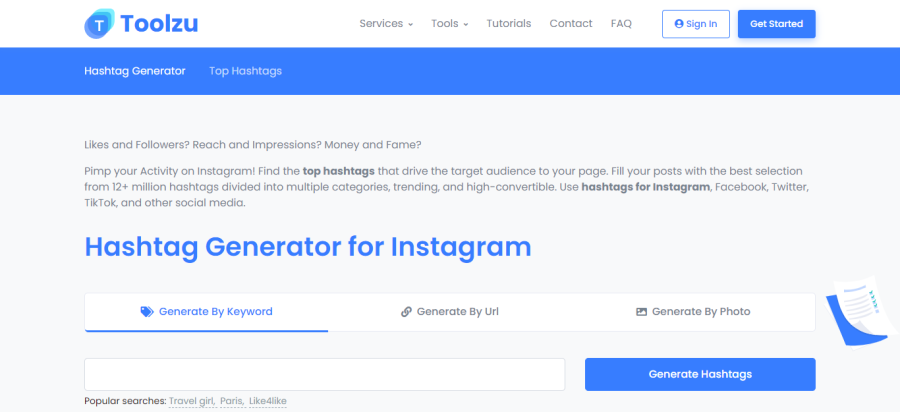 Ini juga merupakan generator hashtag Instagram gratis. Anda dapat mengunggah kata kunci, kompos, atau foto apa pun untuk menghasilkan rangkaian tagar yang sempurna untuk posting Anda. Mereka juga menawarkan layanan lain, termasuk DM otomatis promosi Instagram, penjadwal, suka, dan tampilan, serta manajer perintah.