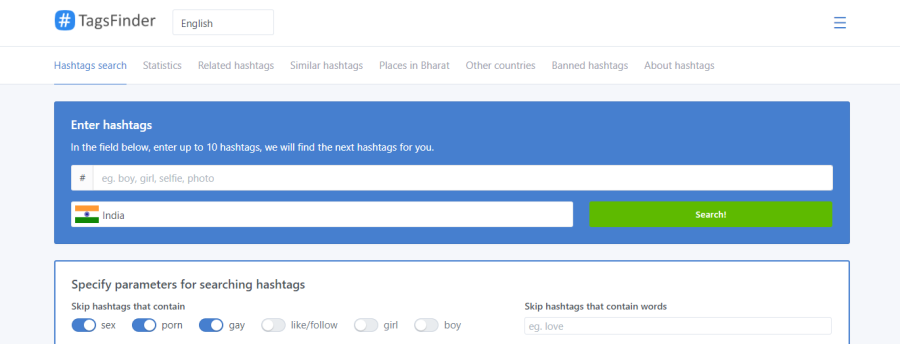 Ini adalah situs yang sangat spesifik dalam hal menemukan tagar. Beroperasi di India, Anda cukup menambahkan kata kunci Anda untuk menghasilkan tagar yang populer di negara tersebut. Ada juga fitur untuk menyaring hashtag dengan kata-kata tertentu. Anda juga dapat memeriksa pengaturan untuk tagar terkait, menutupi tagar serupa, serta tagar terkait dan serupa.