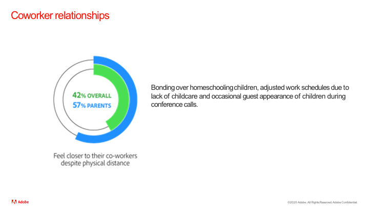 - Jarak membuat hubungan tumbuh lebih kuat – 42% pekerja merasa bahwa mereka mengenal rekan kerja mereka lebih baik sekarang dibandingkan ketika mereka berada di kantor. Dari kelompok ini, 60% orang tua mengaku merasa lebih dekat dengan rekan-rekan orang tua karena mereka terikat pada homeschooling anak-anak mereka dan menyesuaikan diri dengan kehidupan kerja sebagai orang tua yang tinggal di rumah-bekerja.