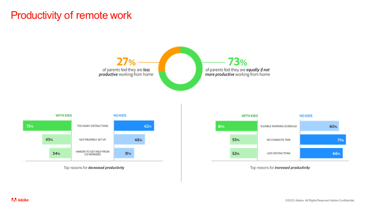 Patrick Knight: Anda benar, 73% orang tua merasa bahwa mereka sama, jika tidak lebih produktif, bekerja dari rumah. Dan alasannya adalah jadwal yang fleksibel, bukan? Ini adalah alasan utama. Mereka merasa bahwa mereka dapat menyeimbangkan hidup mereka sedikit lebih baik. Jadi misalnya, Anda dapat menurunkan anak-anak yang lebih kecil dan mungkin sudah waktunya tidur siang dan kemudian Anda dapat menjadwalkan beban kerja Anda di sana. Atau mungkin setelah makan malam, atau mungkin sedikit lebih awal sebelum anak-anak bangun.