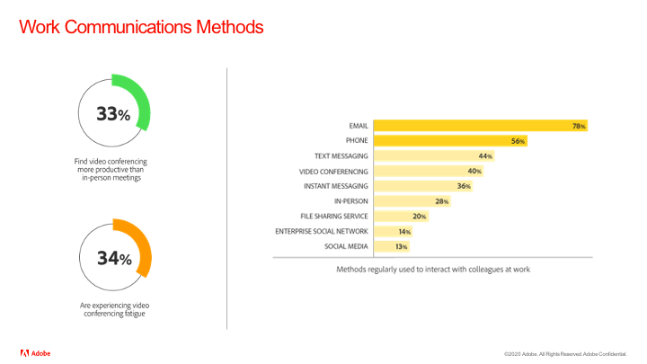 - Kelelahan zoom adalah nyata – Hanya 33% pekerja yang disurvei merasa konferensi video sama produktifnya dengan pertemuan tatap muka dan 34% lainnya mengatakan mereka mulai mengalami kelelahan konferensi video. Sebaliknya, 78% pekerja menggunakan email untuk terhubung dengan rekan kerja, sementara 56% lebih suka melakukan panggilan telepon.