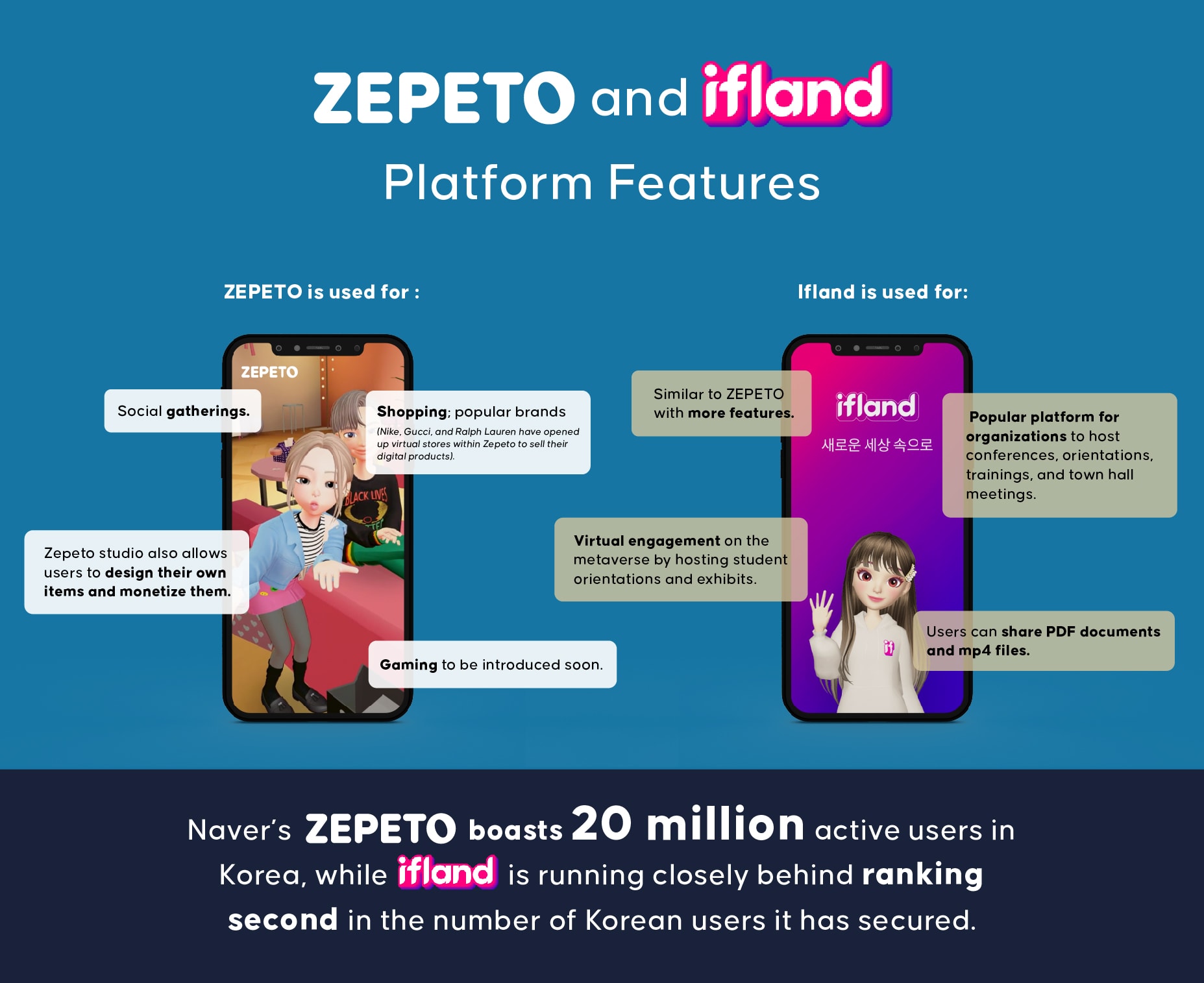 ZEPETO dari Naver Corp adalah aplikasi avatar 3D yang terintegrasi dengan peluang hiburan mulai dari bermain game hingga jejaring sosial. Untuk bersaing secara langsung, SK Telecom meluncurkan platform Metaverse-nya sendiri, Ifland, yang menawarkan berbagai avatar dan ruang virtual. Desain platform yang mendukung realitas virtual menjadikannya peluang yang layak untuk Metaverse – alam semesta realitas virtual yang mempromosikan beragam dunia virtual tempat pengguna dapat menikmati berbagai aktivitas! ZEPETO Naver membanggakan 20 juta pengguna aktif di Korea, sementara Ifland berada di belakang peringkat kedua dalam jumlah pengguna Korea yang telah diamankan.