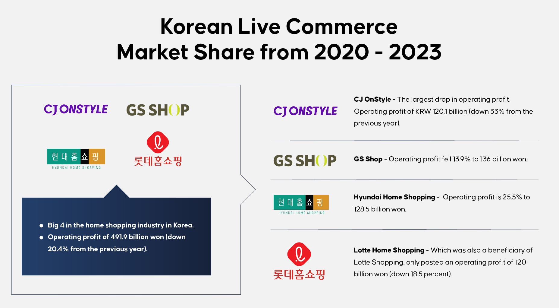 Industri belanja rumah mengalami kerugian operasional secara keseluruhan karena konsumen beralih ke sektor eCommerce. Meskipun Covid-19 mempromosikan penggunaan TV untuk pengguna dan meningkatkan penjualan, biaya transmisi yang tinggi yang dibebankan oleh perusahaan penyiaran telah mengakibatkan bahkan perusahaan paling terkemuka di Korea menghadapi kerugian operasional rata-rata sebesar 20% dari tahun sebelumnya. Biaya transmisi penyiaran pada tahun 2021 adalah 2,3 triliun won, lebih dari setengah pendapatan industri belanja rumahan tahun itu.
