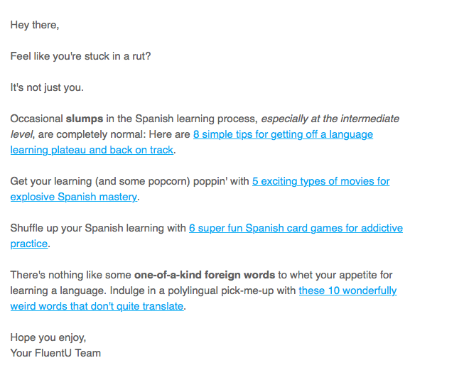 Contoh lain adalah pengenalan cerita pendek berbentuk blog FluentU tentang langkah-langkah sederhana tentang cara belajar bahasa Spanyol: