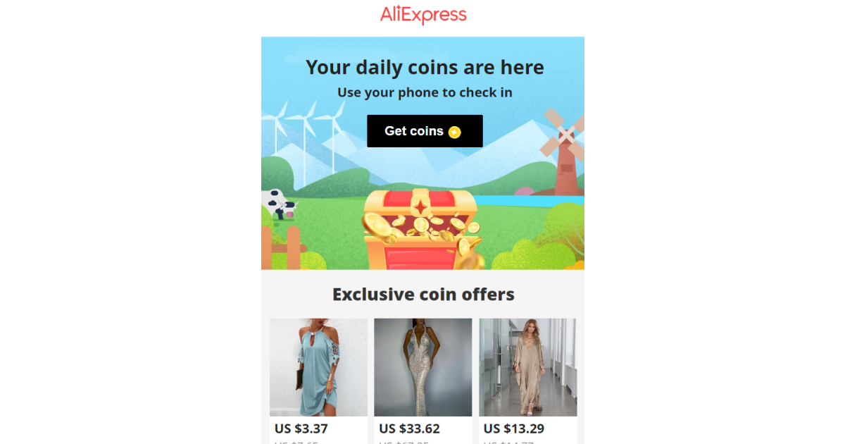 Hal serupa dapat kita lihat di tombol CTA 'dapatkan koin' di AliExpress.