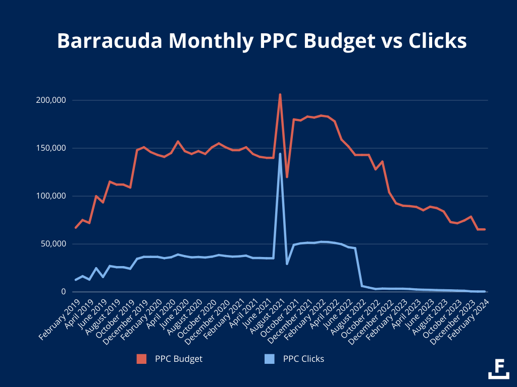 Dua tahun lalu, Barracuda memperoleh 100 ribu klik pada iklan mereka setiap bulan dengan anggaran sekitar $700 ribu. Menurut SpyFu, anggaran tersebut diperkirakan meningkat sebesar $100k, namun jumlah klik sekarang mencapai sekitar 8.500.