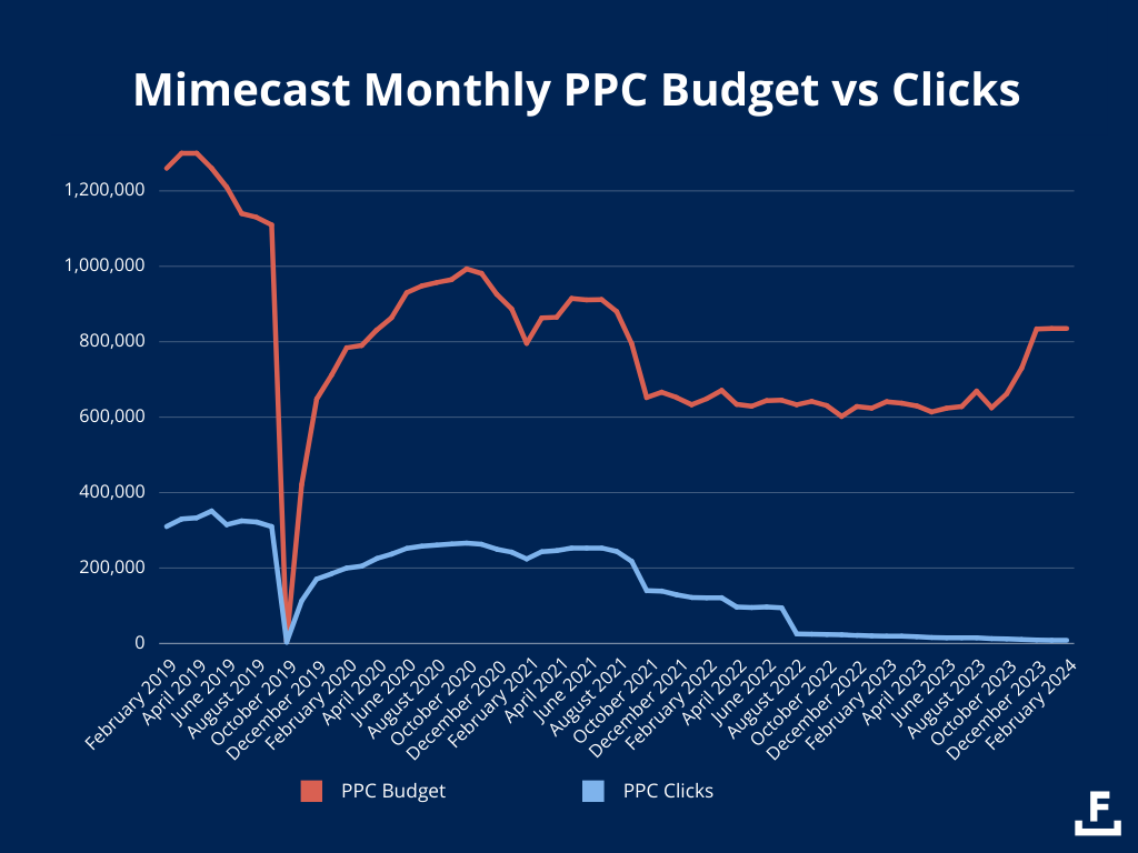 Ini bisa jadi merupakan inflasi BPK dari kata kunci tertentu di bidang keamanan email. Bisa juga Mimecast kalah dari kompetitor saat proses lelang iklan. Atau mungkin audiens menjadi kurang responsif terhadap penelusuran berbayar secara umum.