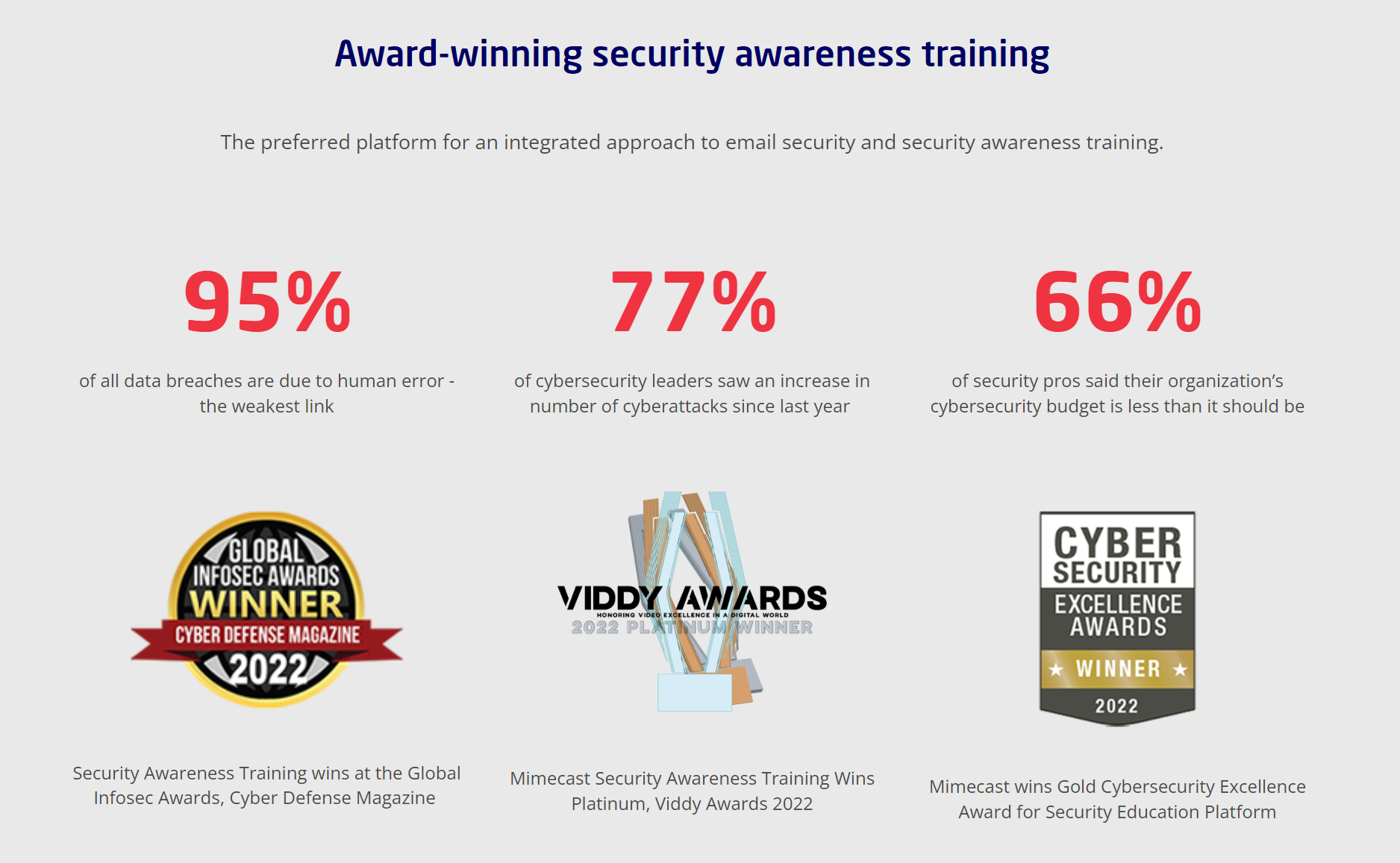 - Bagian membangun kepercayaan yang mencakup statistik penting tentang pentingnya pelatihan kesadaran dan daftar penghargaan terbaru yang dimiliki Mimecast.