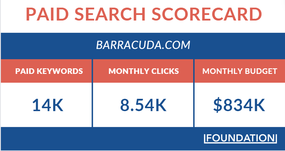 Dengan perkiraan anggaran PPC bulanan sebesar $834k, Barracuda memiliki kemampuan untuk meningkatkan SERP dengan kecepatan yang jauh lebih cepat daripada rute organik. Menurut data dari SpyFu, anggaran besar ini membantu mereka mendatangkan 8.500 klik ke halaman arahan utama setiap bulannya.
