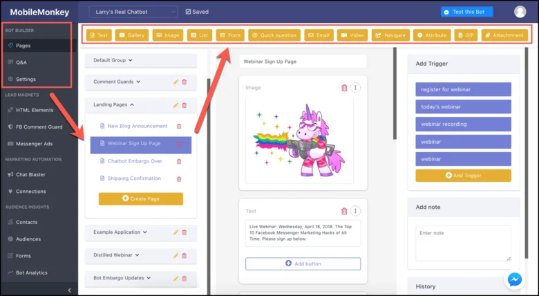Facebook Messenger Marketing memiliki segala sesuatu yang berkaitan dengan chatbots. Chatbot Messenger memungkinkan Anda mengaktifkan otomatisasi pemasaran seperti:
