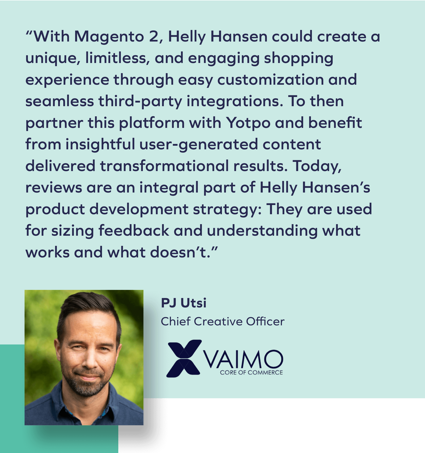 Vaimo berhasil merekayasa replatforming Helly Hansen ke Magento 2 dan mengintegrasikan Yotpo di situs mereka hanya dalam enam bulan.
