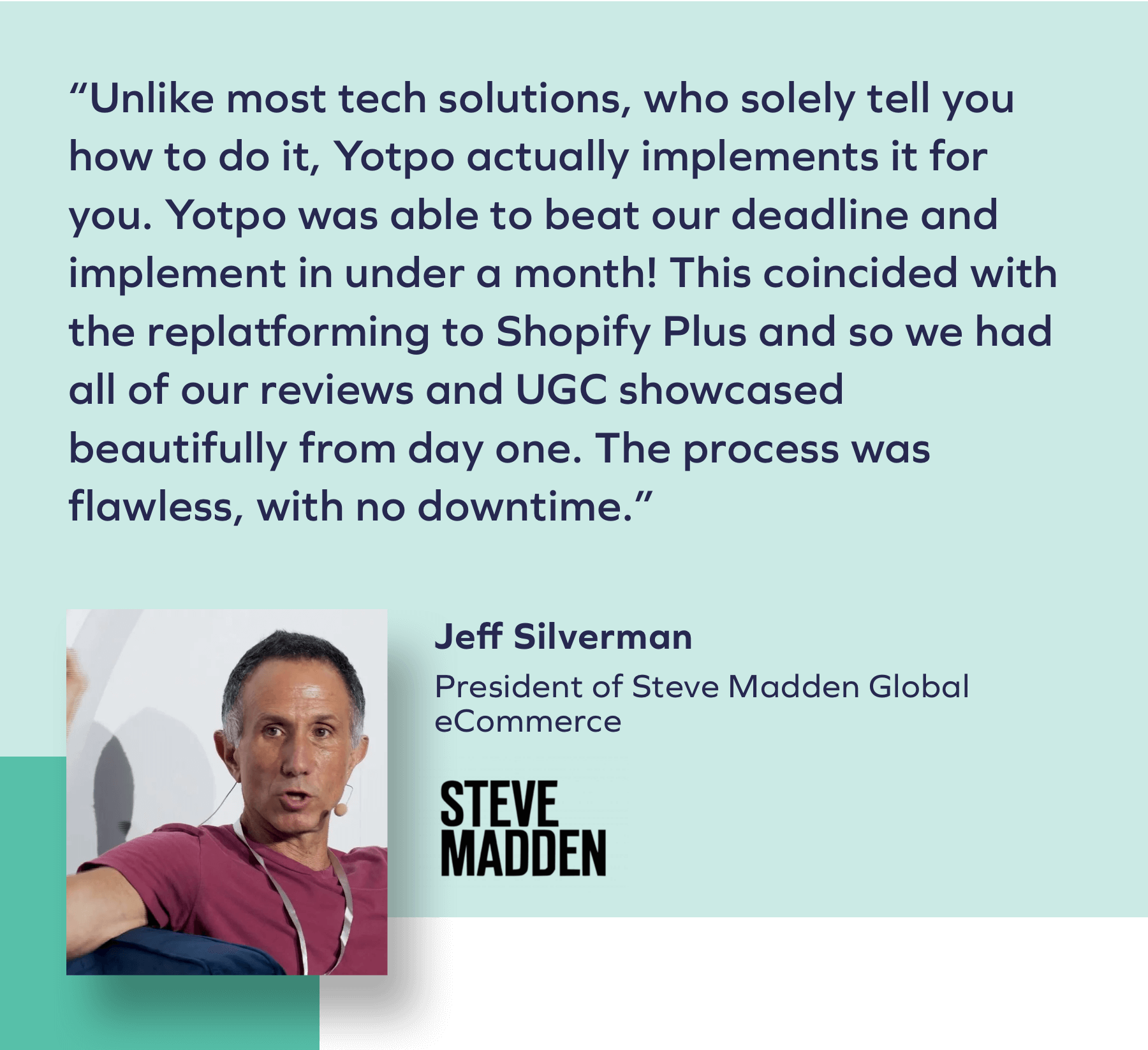 Dengan beralih ke Yotpo sebagai penyedia Ulasan mereka, Steve Madden mampu menggabungkan beberapa solusi teknologi menjadi satu, secara signifikan mengurangi kompleksitas tumpukan teknologi mereka dan menciptakan pengalaman belanja yang konsisten di seluruh domain.