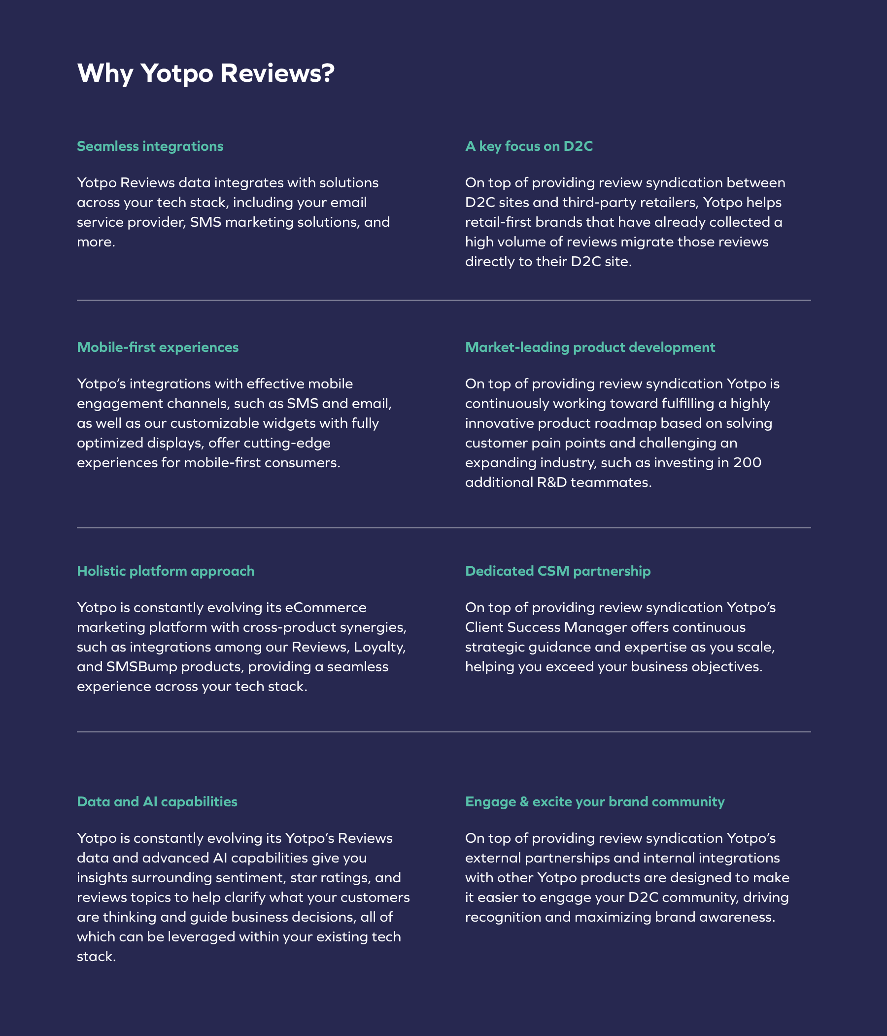 Ulasan Yotpo memberikan berbagai manfaat untuk merek eCommerce. Solusi Ulasan Yotpo memungkinkan merek perusahaan untuk memulai, membangun, dan menumbuhkan komunitas dengan pelanggan Anda dengan menambahkan suara mereka ke identitas merek Anda.