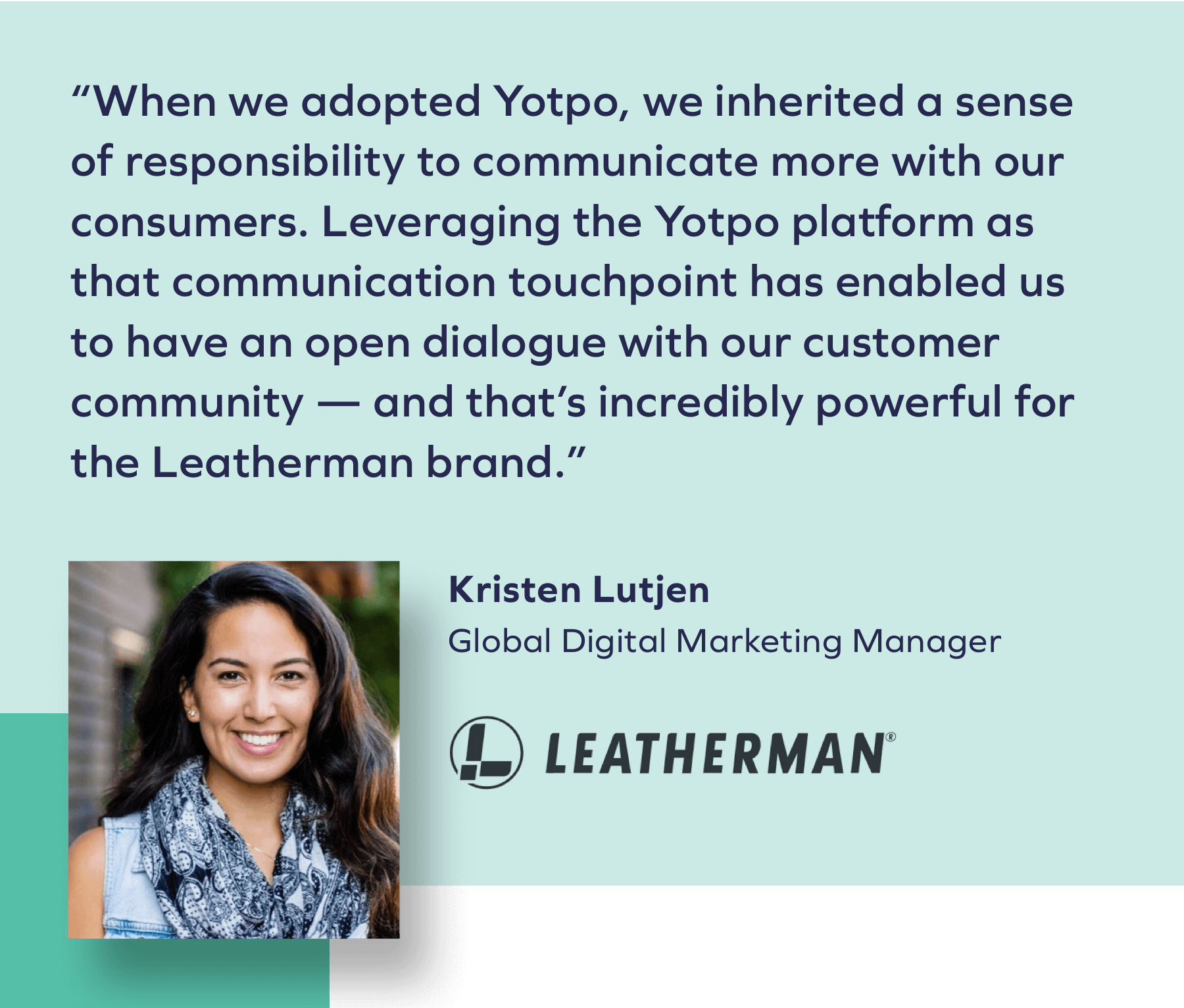 Leatherman beralih ke Yotpo untuk menggantikan solusi mereka sebelumnya dengan platform pemasaran eCommerce Yotpo yang sepenuhnya dapat disesuaikan untuk berintegrasi sepenuhnya dengan Salesforce Commerce Cloud dan mengkonsolidasikan tumpukan teknologi mereka. Tampilan dan nuansa tanggal solusi mereka sebelumnya tidak sesuai dengan identitas merek visual mereka, melepaskan pelanggan dan menghasilkan lebih sedikit ulasan yang dikumpulkan.