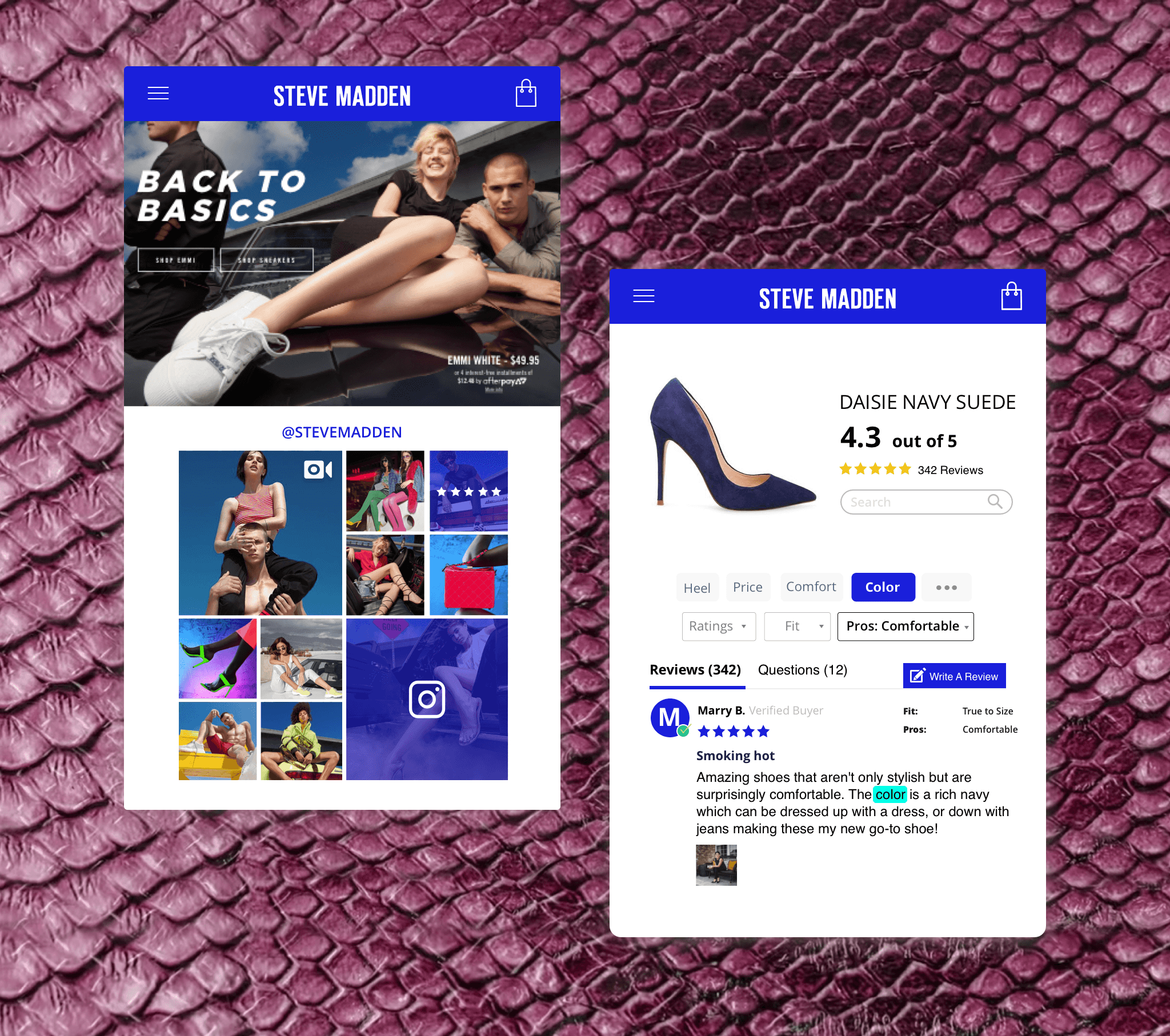 Teknologi yang digunakan Steve Madden untuk mendukung saluran eCommerce mereka mahal, kaku, dan kuno. Karena perusahaan menggunakan tiga solusi teknologi yang berbeda — Bazaarvoice untuk ulasan, Olapic untuk pemasaran visual, dan CrowdTwist untuk loyalitas — pengalaman tersebut, baik untuk Steve Madden maupun untuk konsumen, tidak kohesif.