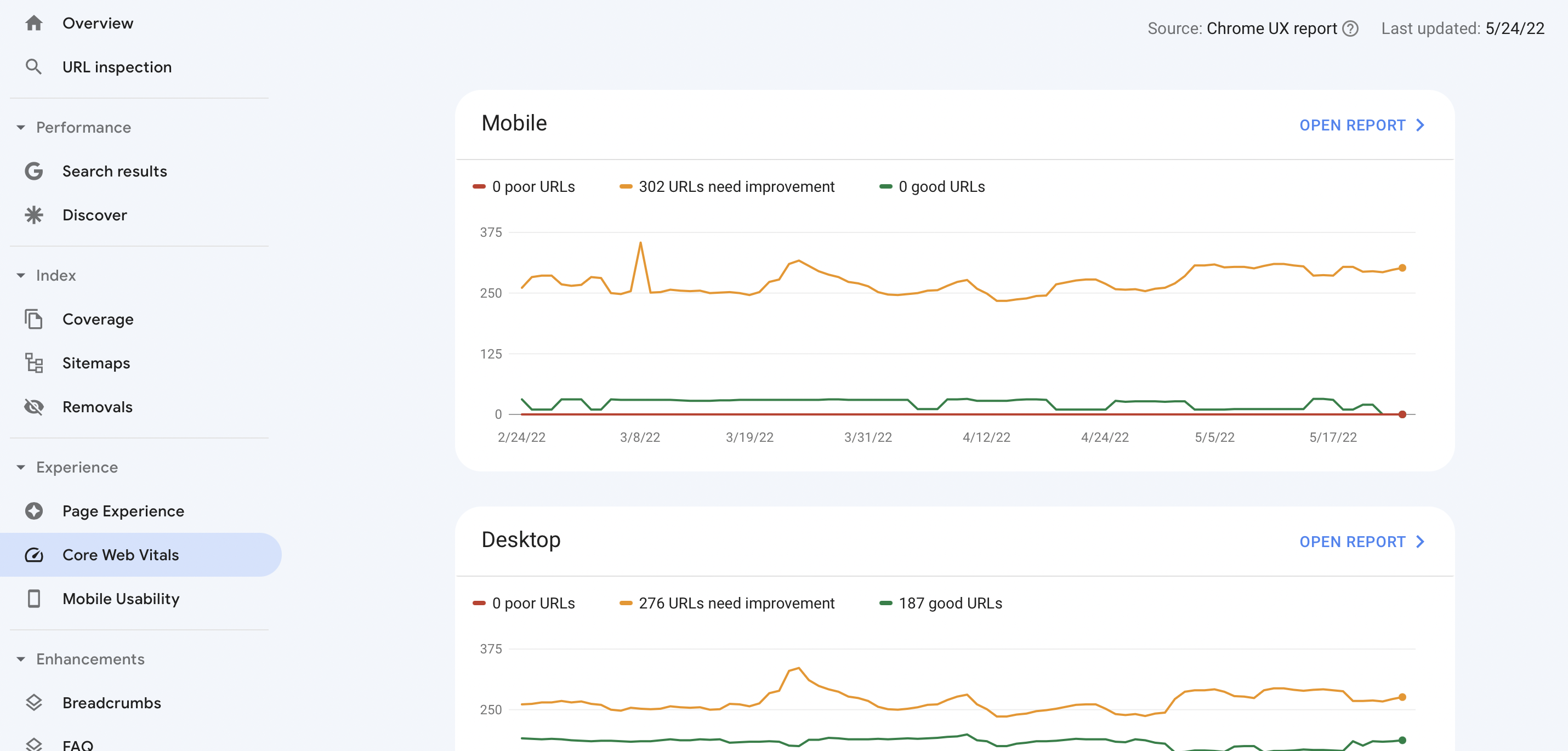 Faktor peringkat ini dapat diukur dalam laporan yang ditemukan di Google Search Console, yang menunjukkan kepada Anda URL mana yang memiliki potensi masalah: