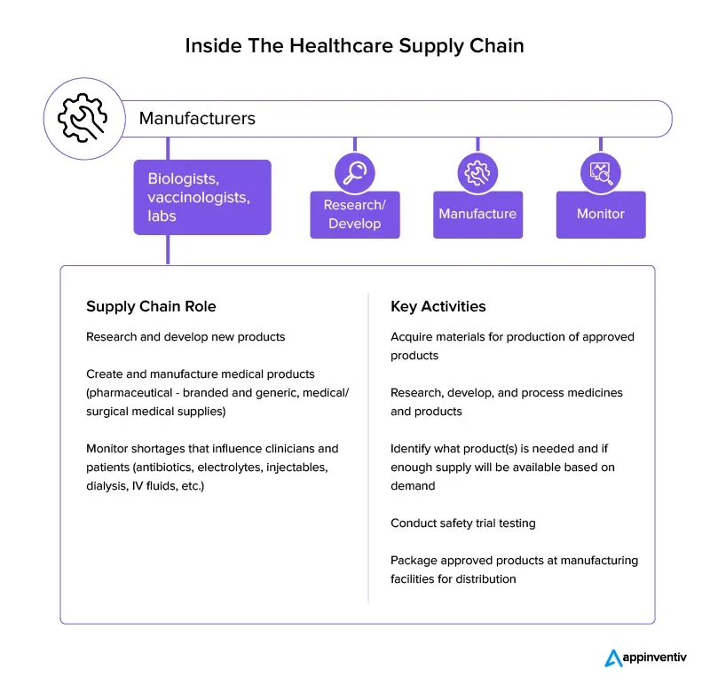 Pengembang standar kualitas farmasi, rumah sakit, sistem kesehatan, apotek, dan penyedia asuransi kesehatan adalah beberapa dari banyak peserta dalam rantai pasokan layanan kesehatan. Namun, produsen dan distributor sangat penting untuk rantai pasokan perawatan kesehatan.