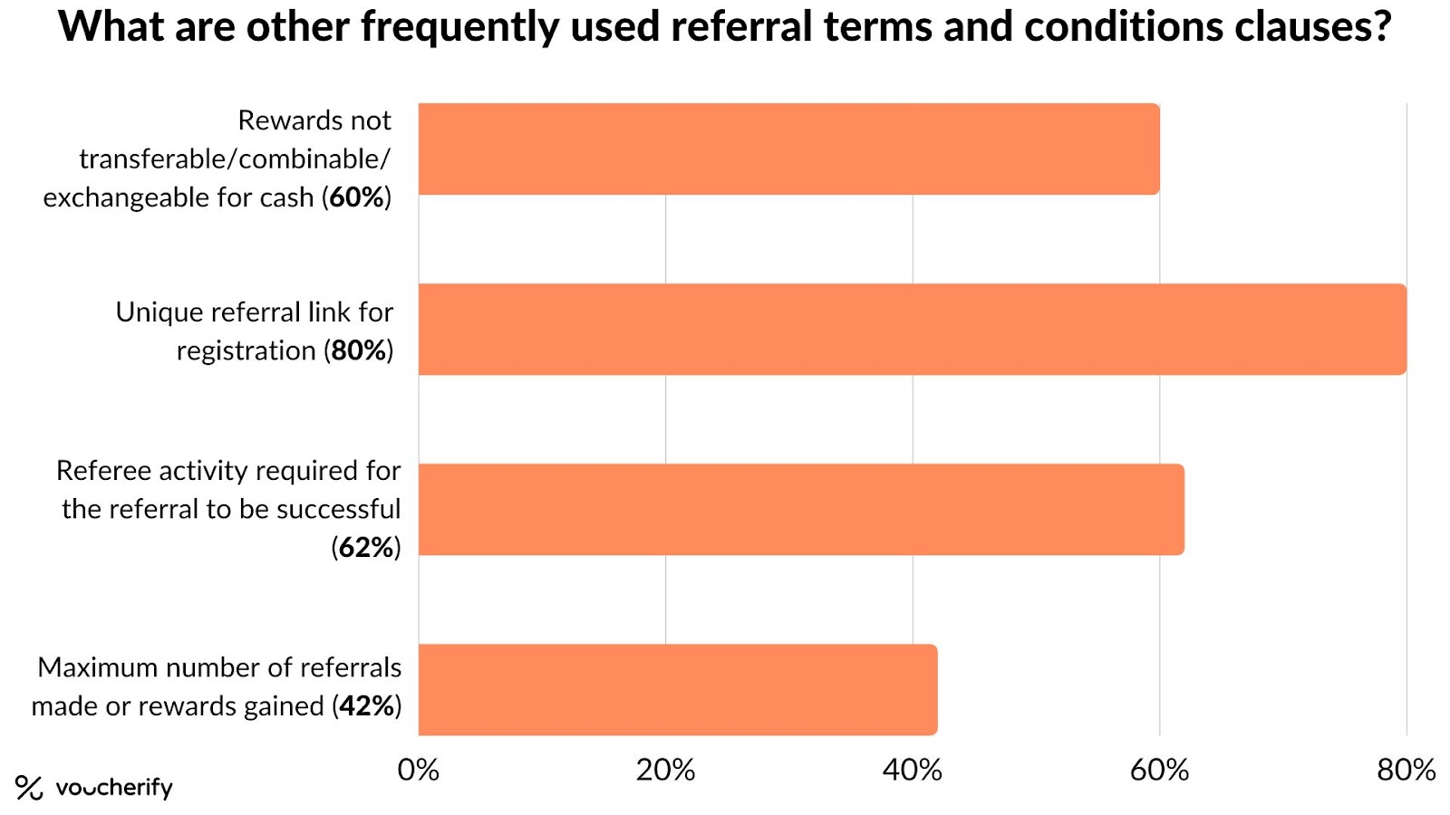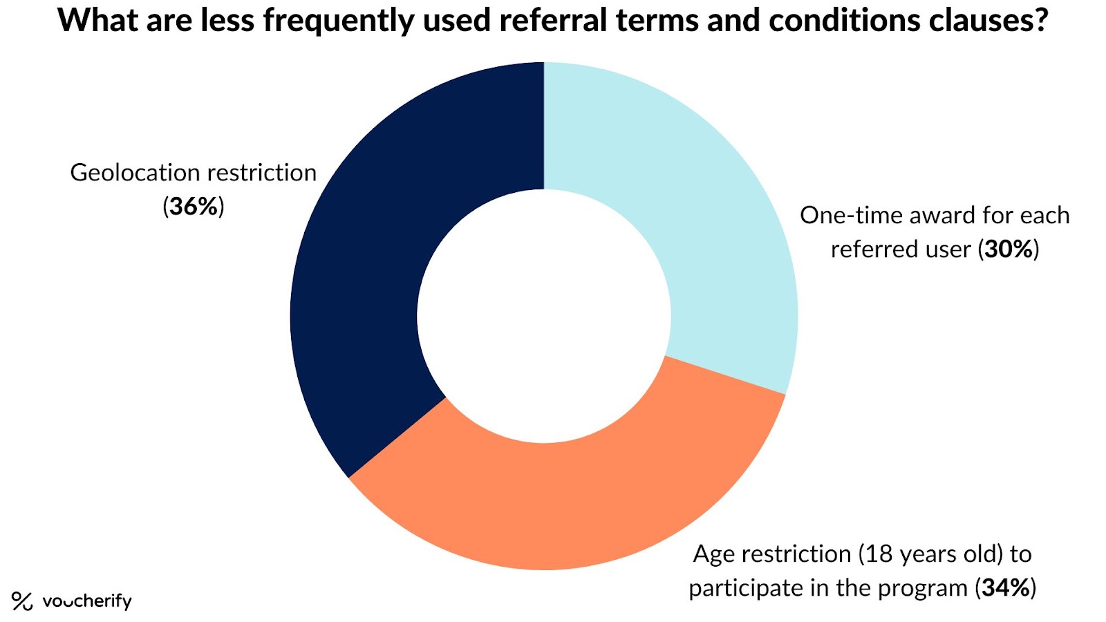 Sebanyak 36% persen dari syarat dan ketentuan yang diteliti mengandung klausul yang membatasi penggunaan program rujukan ke wilayah atau negara tertentu di mana itu berlaku. Selain itu, 30% merek menyebutkan bahwa mereka hanya memberikan satu penghargaan untuk setiap rujukan yang berhasil . Pembatasan yang masih umum dalam S&K rujukan adalah tentang usia wasit – dalam semua kasus ( 34% ), wasit harus berusia minimal 18 tahun untuk berpartisipasi dalam program ini.