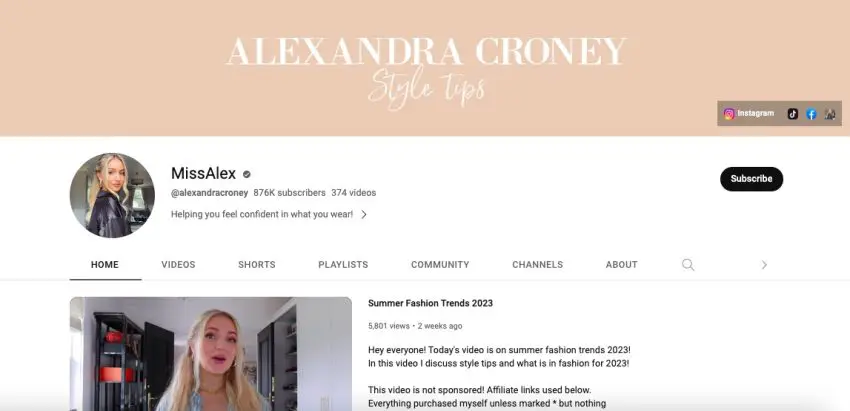 Miss Alex adalah fashion blogger dan berbagi saran fashion, retasan, dan wawasan tentang industri fashion. Konten Miss Alex adalah tentang membantu orang lain menemukan gaya pribadi mereka dengan anggaran terbatas. Miss Alex juga membagikan jenis konten kecantikan dan gaya hidup lainnya sebagai bagian dari salurannya.
