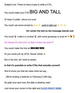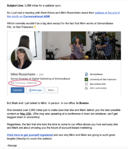 Kemudian Anda masuk ke email dan tiba-tiba ada kisah nyata dari host webinar yang tinggal di seluruh negeri, tetapi meluangkan waktu untuk bertemu langsung di kantor kami saat dia berada di kota, untuk membahas detail webinar. Itu membuat Anda berpikir, “wow, ini akan menjadi webinar yang serius…mungkin saya harus memeriksanya.” Atur panggung di baris subjek dan pertahankan agar tetap terhubung melalui tubuh ke CTA.