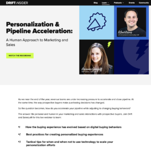 Webinar adalah cara yang bagus untuk mendorong prospek saluran teratas yang dapat Anda kembangkan menjadi pelanggan dari waktu ke waktu. Saya ingin tahu. Saya menghabiskan sebagian besar dari 2 tahun saya di Drift menjalankan seluruh program webinar mereka, sup hingga kacang. Dan sementara ada BANYAK rasa sakit yang tumbuh pada awalnya, (saya seperti 3 bulan keluar dari perguruan tinggi, membuat saya sedikit kendur), akhirnya saluran itu tumbuh menjadi mesin timbal yang stabil dan diminyaki dengan baik.