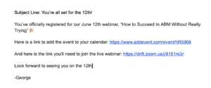 Terakhir, gunakan email atau platform otomatisasi pemasaran Anda untuk mengirimkan email konfirmasi setelah prospek mendaftar. Saya menggunakan tiga platform terpisah di waktu saya di Drift dan menemukan mereka semua sangat mampu mengotomatisasi tugas-tugas dasar seperti konfirmasi.