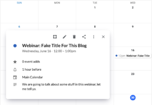Ini tidak 100% diperlukan, terutama jika Anda dapat mengirimkan tautan pengingat melalui platform lain, tetapi saya merasa terbantu memiliki akun AddEvent . Saya dapat memasukkan webinar dengan tanggal, judul, deskripsi, tautan Zoom, dll. dan mengirimkan tautan yang dihasilkan situs dalam email konfirmasi saya kepada tamu yang mendaftar ke webinar. Tautan memungkinkan mereka untuk segera menambahkan webinar ke kalender mereka sehingga mereka tidak lupa bahwa webinar akan segera hadir.