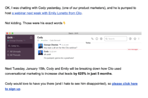 Email yang sangat sederhana, nyata, dan menyenangkan. Itu adalah obrolan Slack yang sebenarnya yang saya miliki dengan Cody. Email mencakup konten dasar webinar, sambil mengecilkan elemen pemasaran pesan yang terbuka. Ada elemen manusia yang hebat yang berperan di sini juga. Ini adalah orang-orang nyata, bukan hanya robot pemasaran. Ini adalah email menyenangkan yang masih memberikan nilai.